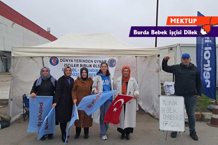 Hendek ilçesinde 2. Organize Sanayi Bölgesinde bulunan Burda Bebek Ürünleri Sanayi ve Ticaret AŞ’de 35 gündür haklarımız için direnişteyiz. Ağır çalışma koşullarımız var. İşimiz çok hafife alınıyordu, yeni gelen hiçbir arkadaşımız tecrübeli olanların işini yapamıyordu ki bu çok doğal. Üç kişinin yapacağı işi tek kişiye yaptırıyorlardı. Ücretlerimizde hiçbir şekilde artış olmuyordu. 12 saat çalışıyorduk, zorunlu mesaiye zorlanıyorduk. “Özel durumu olan gelsin söylesin” diyorlardı ama “Babam gözünden ameliyat olacak, yanında olmam lazım” dediğimde “Mesaiye kalman lazım, ameliyatı sen yapmayacaksın ki” yanıtını almıştım.