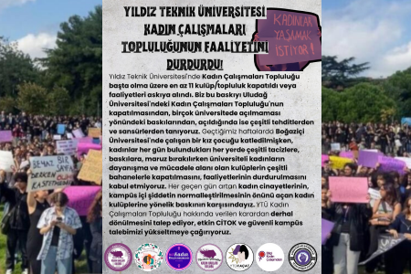 Yıldız Teknik Üniversitesi’nde (YTÜ) kulüp ve topluluklardan da sorumlu olan Sağlık Kültür ve Spor Daire Başkanlığı (YTÜ SKS) dün en az 11 kulüp ve topluluğun bir dönemliğine faaliyetlerinin askıya alınmasına ya da kapatılmasına karar verdi. Kapatıldığı veya askıya alınan kulüp ve topluluklar ise şöyle: Astronomi Kulübü, Fizik Kulübü, Münazara ve Müzakere Kulübü, Fotoğrafçılık Kulübü, Kadın Çalışmaları Topluluğu, Meditek, Tiyatro Kulübü, Sinema Kulübü, Hayvan Hakları Kulübü, Felsefe Kulübü, Bilim Kurgu ve Fantastik Kulübü.YTÜ’de Kadın Çalışmaları Topluluğu dahil 11 kulübün kapatılmasına tepki gösteren 8 üniversite kadın kulübü, şiddete karşı kadınların dayanışma ve mücadele alanlarının hedef alındığını söyledi.