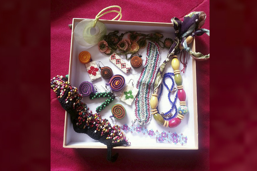 bir de kendi yaptığımı koydum kutuya… öyle ya kendim de kendim için yapmıştım. o zamanlar gözlerim güzel görüyordu kendime bir bileklik yapmıştım mavi minik boncuklardan o da kutunun en alt sağında.. birisi çiğdem’den hemen üstünde onun... ankara’dan kargoyla göndermişti. o zarif bileklik... takmaya kıyamıyorum bazen. sakarım ya, ya üstüne bir şey dökerim incinir sanki bileğimde bileklik… şu taşları iri olanı ulviyecim yapmıştı. ilk etkinliğimde bir arkadaşının yapıp ona verdiği kolyeyi bana renk versin diye etkinlikte takınca, ben de çok sevince aynısını o da bana yapmıştı sonra, renkleri değişerek bir tane de kardeşime anımsıyorum. şu rengarenk küpeler hopalı kadınlardan . “senede bir gün” kadınları rengarenk döküvermişti elimize meral’le bana hopa’da. buyurun seçin dediklerinde içlerinden seçeceğiz sanmıştık. “yarı yarıya alın işte” dediler… ne sevinmiştik… örgüden olanları tek tek aldık yalnızca… birisi meral’de birisi bende olsun aynı küpenin... o en üstteki oyalı kolyeyi hatırlamıyorum iyi mi. kim örmüştü bana... annemin çeyiz sandığında mı yoksa… hayat ne garip anımsamıyorum ama pek seviyorum. sonra bir gün bizden bir şifa çemberine giderken fulya takmıştı o gün kolyeyi. sonrasında getirip bana verdi ya benim kolyemi geri. sanki fulya’dan hediye gibi oldu imgelemimde. artık onun adıyla takıyorum hep… aa bir tane daha var ulviye’den: sağ alt köşeden sarkan siyahlı… örgüdür o… pek severim kış günlerinde takmaya daha uygun bir kolye… ısıtıyor resmen kolye deyip geçmeyin… o iri taşlının içindeki çiçek’ten geldi. o satın aldım ablacım dedi verirken ben yapmadım… bana sıklıkla kolyeler bileklikler yüzükler alır çiçek.. taşır. ben hepsini de o yaptı olarak kabul ediyorum öyle kabul ettim içimde… simge olarak bir tanesini koydum kutuya..