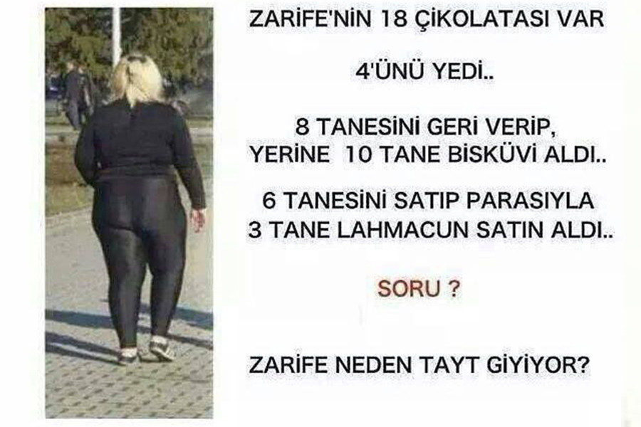 Bu teknolojinin nimetlerinden faydalanalım diye sosyal medyadaki zayıflama gruplarına takılır oldum, fakat görseli görünce “Aman Allah’ım!” dedim kendi kendime. “Kim bu arkadan çekilmiş Zarife?” Adının Zarife olduğundan bile emin olmadığımız Zarife, Zarife’nin çikolatası, bisküvisi, lahmacunu derken “Zarife neden tayt giyiyor” sorusunu bir türlü algılayamadım. Güya mantık sorusuymuş, mantık bunun neresinde? Zarife’nin mantık sorusuna maruz kaldığından haberi var mıydı?