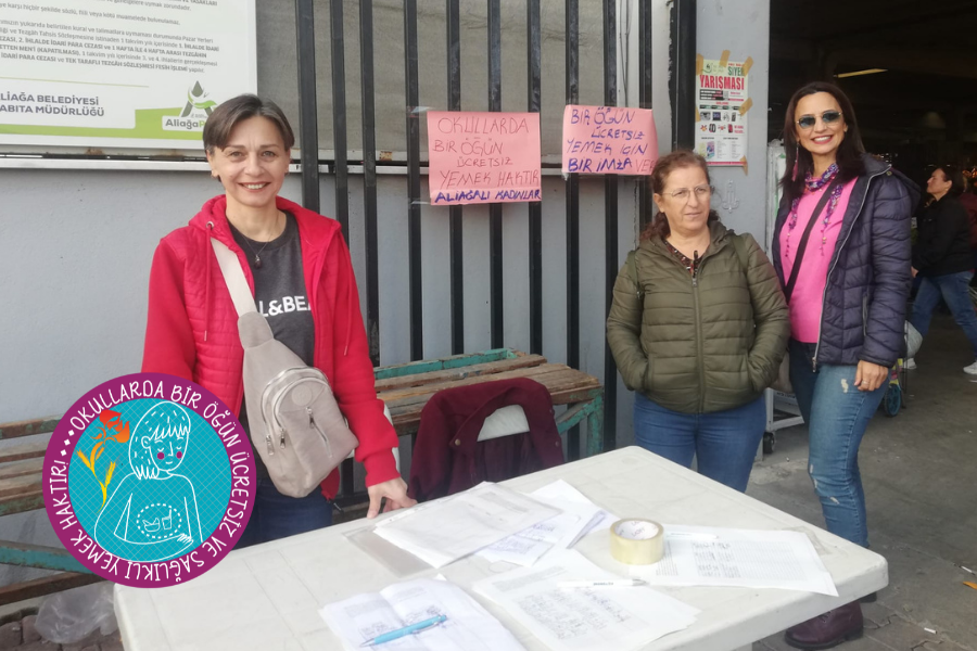 Aliağalı kadınlar olarak Ekmek ve Gül'ün çağrısı ile başlayan "Okullarda bir öğün ücretsiz sağlıklı yemek verilsin" kampanyasını bizler de kendi mahallelerimizde, çocuklarımızın gittiği okullarda yürütmeye başladık.