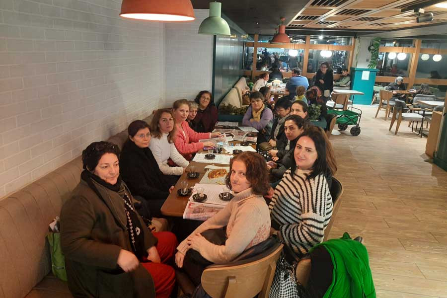 Güzelbahçe Halk Eğitim Merkezinde bir araya gelen gönüllü kadın arkadaşlarımız da polar ve battaniye dikerek destek oldukları deneyimlerini heyecanla anlattılar. Dernekler ve cemevlerinde oluşturulan deprem dayanışma merkezinin bilgileri, özellikle yakın çevremizdeki aileler için yardım kampanyaları (eşya sağlamak ya da kumbara oluşturmak gibi) hedeflenirken depremden zarar gören, yakınlarını kaybeden Ekmek ve Gül grubundan kadın arkadaşların isimlerini belirledik.
