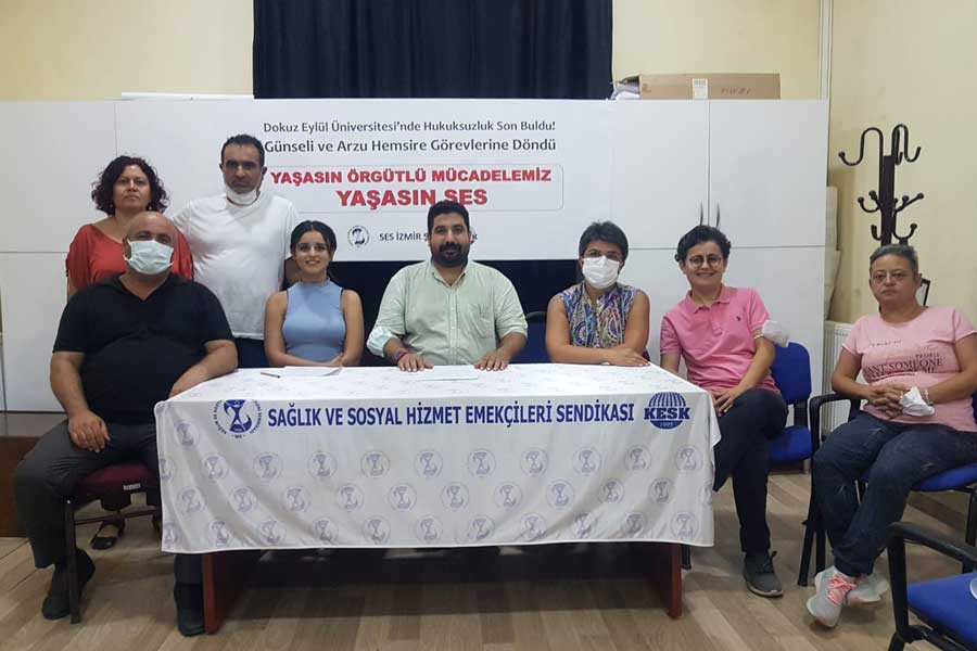 İşe girdiği hafta sendikaya üye olan, işe başladıktan 3 hafta sonra, pandemide alınmayan önlemler yüzünden kaybettikleri meslektaşlarını andıkları için Sağlık ve Sosyal Hizmet Emekçileri Sendikası (SES) İş Yeri Temsilcisi Günseli Uğur ile birlikte 8 Mart 2020’de açığa alınarak, işyerinden uzaklaştırılan DEÜ SES İş Yeri Temsilcisi Arzu Sert, yaşadıklarını ve kazanımla sonuçlanan mücadelelerini yazdı.