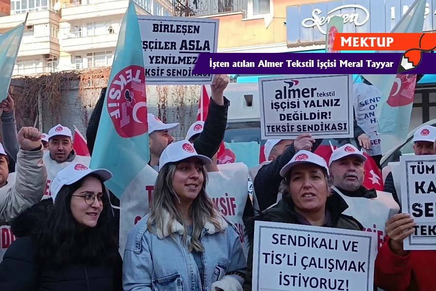 Fakat ben Yataş Havlu Fabrikası'nda beş buçuk yıl çalıştım. En son 7 yıl çalıştığım Almer Tekstil'de sendika üyesi olduğum için işten atıldım. Sendikaya üye olduğumuz için mobbingler uygulanmaya başladı. Bizi tek tek odaya çağırıp zorla e-devlet şifrelerimizi isteyip sendikadan üyelikten çıkmamız istendi. Müdür sendikadan istifa edip bize gösterin size çok iyi zamlar vereceğiz diye söz verdi. Ben de yedi yıldır burada çalıştığımı verilen sözlerin hiçbirinin yerine getirilmediğini asgari ücret artı beş yevmiye ile yıllardır çalıştığımızı ve bu beş yevmiyeyi de pazar günü gelmeyerek aldığımızı dolayısıyla onlara nasıl güvenebileceğimi söyledim.