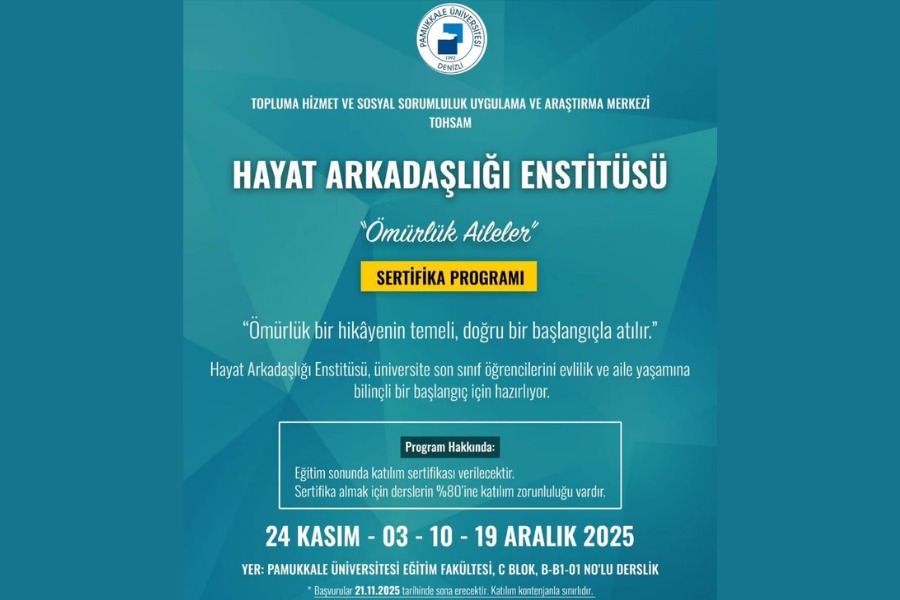 Pamukkale Üniversitesi, Topluma Hizmet ve Sosyal Sorumluluk Uygulama ve Araştırma Merkezi (TOHSAM) aracılığıyla “Hayat Arkadaşlığı Enstitüsü” başlıklı bir program duyurdu. Afiş, “ömürlük hikayenin temeli doğru bir başlangıçla atılır” sloganıyla son sınıf öğrencilerini evlilik ve “aile yaşamına bilinçli başlangıç”a çağırıyor.