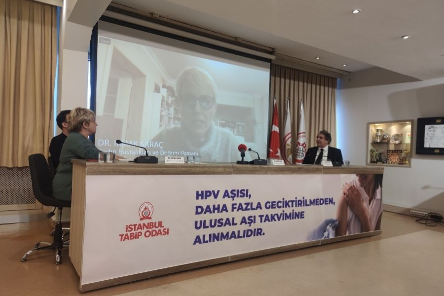 Açıklama öncesinde TTB Kadın Sağlığı Kolu’ndan Irmak Saraç’ın HPV aşısı hakkında bilgi verdiği bir video gösterildi. Rahim ağzı kanserinin dünyada kadınlarda en sık görülen 4. kanser olduğunu ifade eden Saraç, “En çok kanserle ilişkilendirilen iki tip HPV virüsü tip 16 ve tip 18’e karşı aşı, 2016’da FDA tarafından onaylandı, hızlıca Türkiye’ye geldi” dedi. Bu aşıların kansere karşı yüzde 90 oranında koruyucu olduğunu aktaran Saraç, “Aşı 15 yaş altına uygulandığında çok daha koruyucu. Ancak 15 yaşa kadar aşı olunmadıysa 26 yaşa kadar, sonrasında ise riskli gruplara uygulanabilir. Aşının arkasından etkin tarama testi yapılmalıdır. Tüm aşılarda olduğu gibi HPV aşısına da karşı görüş bildiren kişiler var ancak güvenlik testlerinde herhangi bir olumsuz bulgu elde edilmedi” ifadelerini kullandı.
