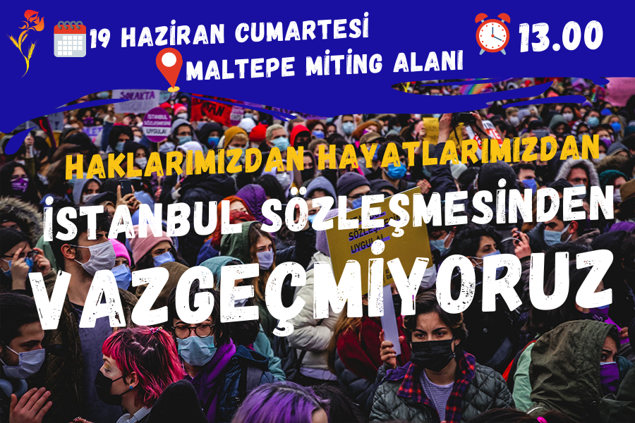 Çünkü, İstanbul Sözleşmesi’ni bir gecede ortadan kaldırmak isteyenler, tepkisiz kalırsak başka haklarımızı da yok etme planlarını hayata geçirecek; Çocuk yaşta evliliklere af getirmek dillerinde, çocukları cinsel şiddet karşı koruyan maddeleri olan Lanzarote Sözleşmesini kaldırmak hedeflerinde, kadınların şiddetten korunması için en temel yasa olan 6284 sayılı yasanın ve dahasının peşlerindeler! Bizi şiddete mahkum etmek isteyenlere, bizi karanlık bir geleceğin seyircisi yapmak istemelerine, susup oturmamızı bekleyenlere cevabımızı 19 Haziran günü birlikte verelim!