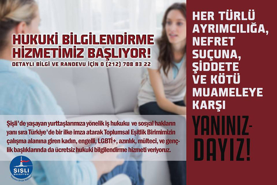 Şişli Belediyesi, Şişli’de yaşayan yurttaşların iş hukuku ve sosyal hakların yanı sıra kadın, LGBTİ, engelli, genç, azınlık ve mültecilere yönelik ücretsiz hukuki bilgilendirme hizmetini de hayata geçirdi.