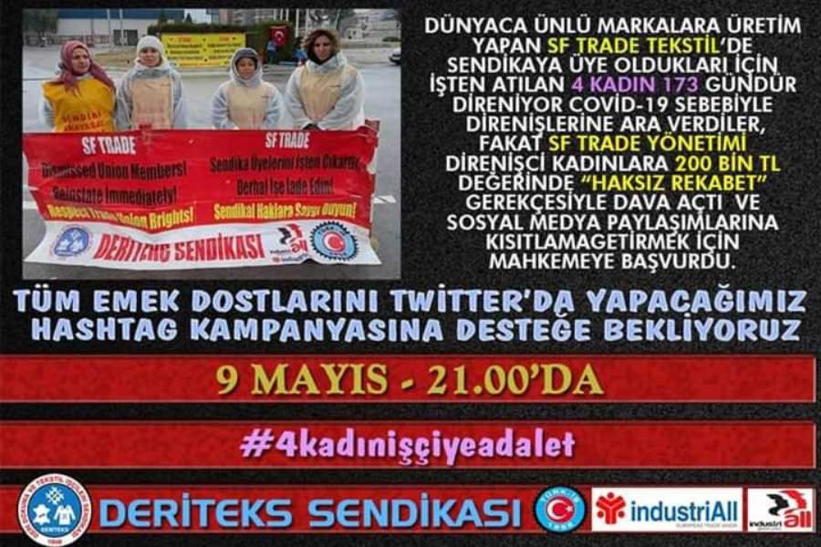 Sendikaya üye oldukları için işten atılan ve 173 gündür direnişlerini sürdüren SF Trade Tekstil işçisi 4 kadın, kovid-19 salgını nedeniyle serbest bölge içindeki direnişlerine bir süre ara vermişti. İşçiler açlık ve salgınla mücadele ederken, patron durmadı. Salgın nedeniyle adli tatile rağmen her bir kadın işçiye, haksız rekabete yol açmak, şirketin bilgilerini paylaşmak iddialarıyla, 200 bin TL’lik dava açıldı. Ayrıca sosyal medya paylaşımlarının durdurulması için de mahkemeye başvuruldu.