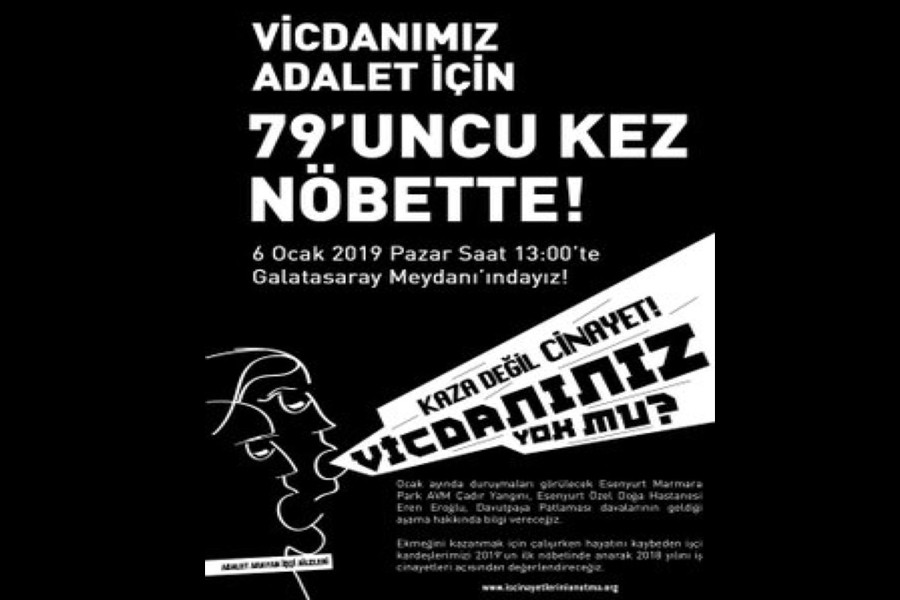 Her ayın ilk Pazar günü iş cinayetlerinde yaşamını yitiren işçileri anmak için Galatasaray Meydanı’nda Adalet Nöbeti tutan Adalet Arayan İşçi Aileleri bu ay da saat 13.00’te Galatasaray Meydanı’nda “adalet” diyecek. Tüm işçileri, emekçileri, emek dostlarını 79. Adalet Nöbetine çağıran Aileler şu çağrıyı yapıyor: