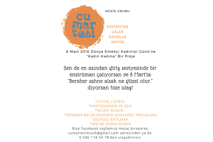 2017’de kurulan ve 16 Nisan 2017’deki başkanlık referandumu öncesinde pazar yerlerini gezerek “Hayırdır Aysun” parçalarını çalmalarıyla İzmir’de tanınmaya başlayan Cumartesi, 8 Mart 2018 Dünya Emekçi Kadınlar Günü için bir proje ortaya koyuyor. Cumartesi, kendileriyle çalmak isteyecek, her beceri seviyesinden enstrüman çalan ve İzmir’de yaşayan trans ve natrans kadın müzisyenlere çağrıda bulunuyor.