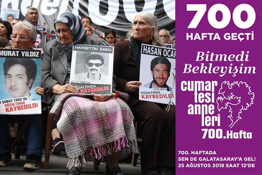 Çocuklarının, eşlerinin, kardeşlerinin akıbetini sormak amacıyla 1995 yılından bu yana Galatasaray Meydanı’nda bir araya gelen Cumartesi Anneleri 700. haftada herkesi yanlarında olmaya çağırıyor.