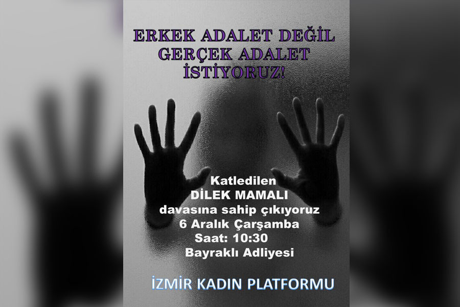 15 yıldır dini nikahlı yaşadığı erkek tarafından öldürülen Dilek Mamalı cinayeti davası bugün İzmir Bayraklı Adliyesi 9. Ağır Ceza Mahkemesinde görülecek. Davayı takip eden İzmir Kadın Platformundan kadınlar davaya çağrı yaparak ‘Katledilen Dilek Mamalı davasına sahip çıkıyoruz, erkek adalet değil, gerçek adalet istiyoruz’ diyorlar.