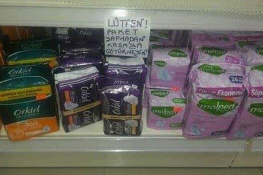 Kapmüs Cadıları Twitter hesabından paylaşılan bir fotoğraf sosyal medyada birçok kadının tepkisini çekti. Bir market rafının ped bölümüne yapıştırılan notta “Lütfen paket yapmadan kasaya götürmeyiniz” yazıyor.