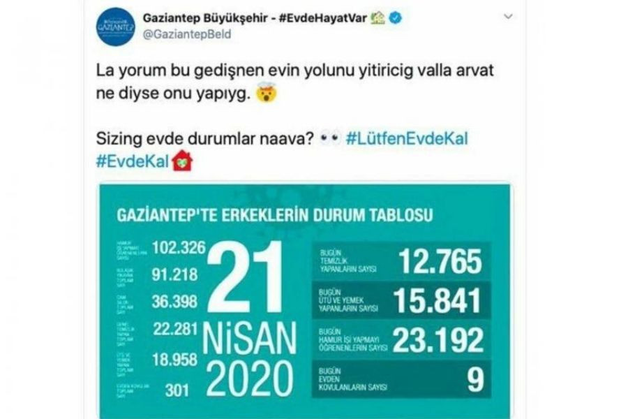Gaziantep Büyükşehir Belediyesi resmi Twitter hesabından 21 Nisan 2020 tarihinde paylaşılan "Gaziantep'te Erkeklerin Durum Tablosu" tweet'i tepki topladı.