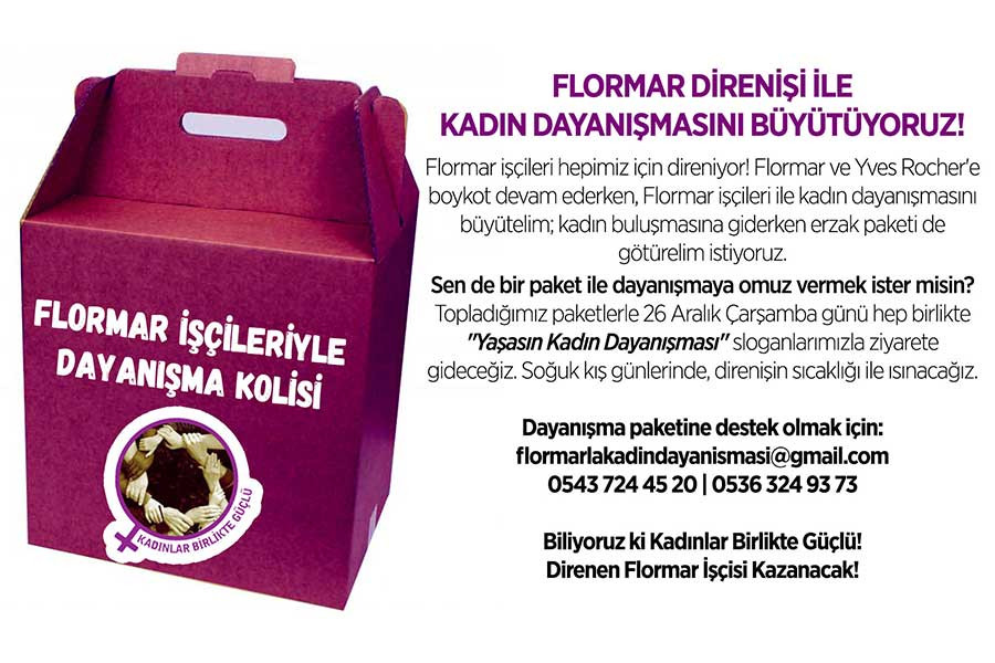Flormar ve Yves Rocher boykotu devam ederken, Flormar işçileri ile kadın dayanışması da büyüyor. Kadınlar Birlikte Güçlü 26 Aralık Çarşamba günü Flormar işçilerini ziyarete gidiyor. “Bu soğuk günlerde içimizi ısıtacak sıcacık bir dayanışma için Flormar işçilerine erzak kolileri götürüyoruz” diyen Kadınlar Birlikte Güçlü, herkesin desteğini bekliyor.