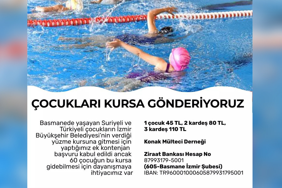 Konak Mülteci Derneği paylaştıkları dayanışma çağrısında şunları söyledi: “Basmane’de yaşayan Suriyeli ve Türkiyeli çocukların İzmir Büyükşehir Belediyesi yüzme kursuna gitmesi için yaptığımız ek kontenjan başvurusu kabul edildi ancak 60 çocuğun bu kursa gidebilmesi için dayanışmaya ihtiyacımız var”.