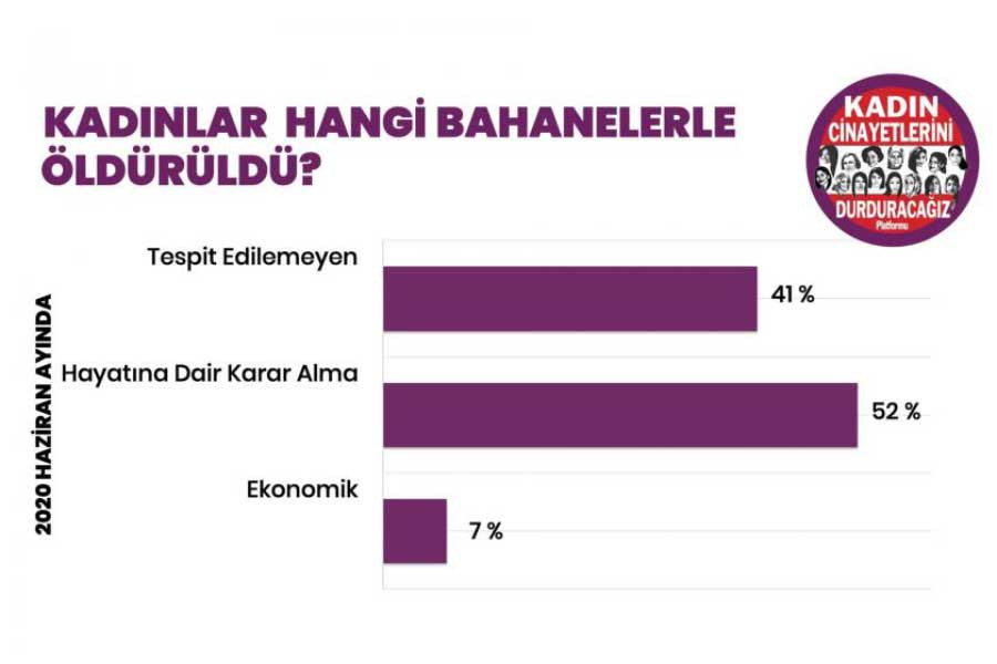 “Öldürülen 27 kadından 11’inin neden öldürüldüğü tespit edilemedi, 2’si ekonomik bahaneyle, 14’ü de boşanmak istemek, barışmayı reddetmek, ilişkiyi reddetmek gibi kendi hayatına dair karar almak isterken öldürüldü. 11 kadının hangi bahaneyle öldürüldüğünün tespit edilememesi, kadına yönelik şiddetin ve kadın cinayetlerinin görünmez kılınmasının bir sonucudur. Kadınların kim tarafından, neden öldürüldüğü tespit edilmedikçe; adil yargılama yapılmayıp şüpheli, sanık ve katiller caydırıcı cezalar almadıkça, önleyici tedbirler uygulanmadıkça şiddet boyut değiştirerek sürmeye devam ediyor.”