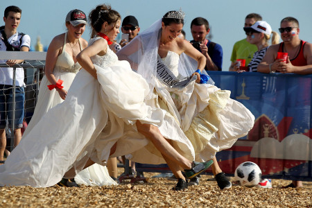 2018 Dünya Kupası’nın ev sahibi Rusya’ya bağlı Tataristan’ın başkenti Kazan’da gelinlik giyen kadınlar sahaya indi. Ayaklarına topu alan ‘gelinler’ dostluk maçı yaptı.