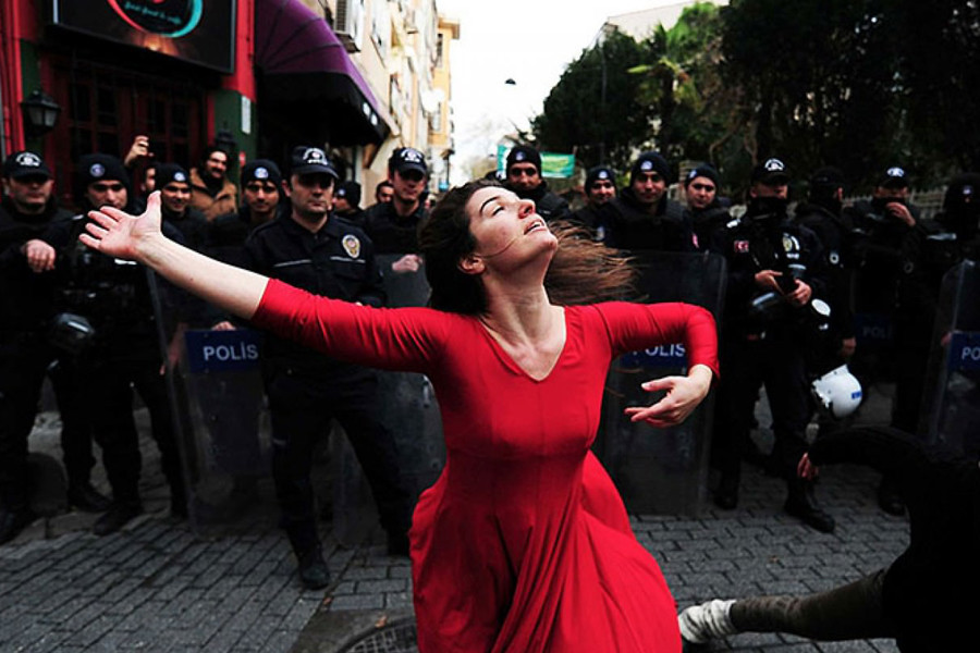 İstanbul, Kadıköy'de, 2014 yılında Caferağa Dayanışma Platformu’nun kullandığı tarihi binayı polisin demirle kaynak yaparak kapatması üzerine bir kadın polisi dans ederek protesto etti.