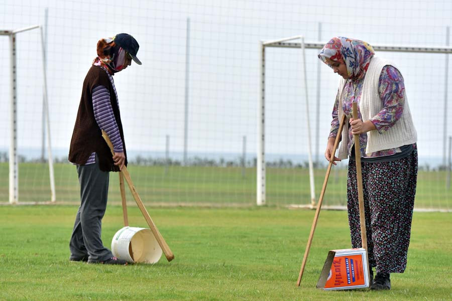 Yaz döneminden itibaren bakıma alınan sahalarda tohum ekimi, çim biçme sonrası ot yolma, topraktaki taşları ayıklama gibi işlerde kadınlar günlük 70 liraya çalışıyor.