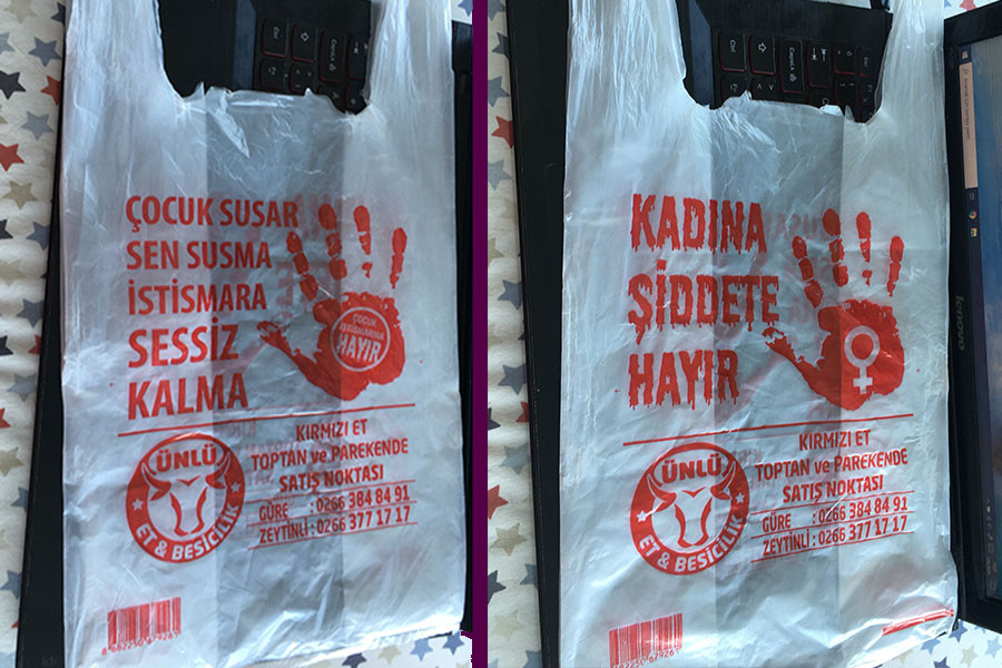 Poşetin bir yüzünde, “kadına şiddete hayır”, diğer yüzünde “istismara sessiz kalma” yazıyor.