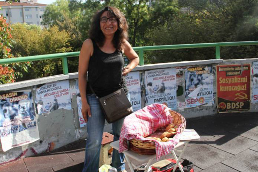 Kolej’de bulunan ve Ankara’nın en işlek köprülerinden biri olan Doksanaltılılar Köprüsü’nde güneşin kendisini göstermesiyle tezgahını açan Aynur Kıraç, kendi yaptığı poğaçaları satıyor. Yüzünden gülümsemesi eksilmeyen ve köprüden her geçeni “Günaydın” diyerek karşılayan Aynur, enerjisiyle dikkat çekiyor.