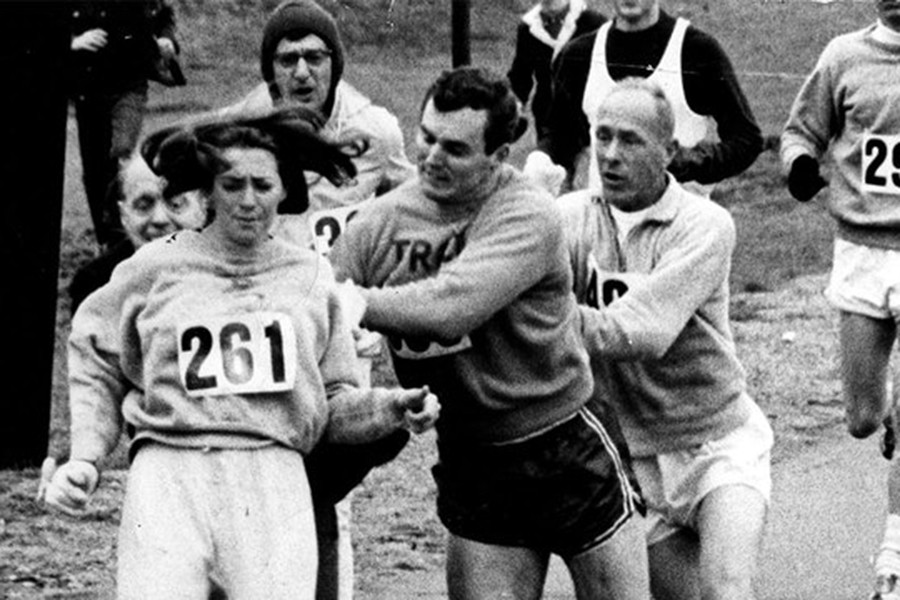 Yarışın öyküsü de Kathrine’nin hayatı gibi bir hayli ilginç. 1967 yılı Boston Koşusu’nun olduğu gün Kathrine, erkek arkadaşı ve koçu koşunun olduğu alana gelir. Kathrine yağmurun da oluşundan faydalanarak ceketinin şapkasını geçirir ve kendini saklar. Adını listeye K. Switzer olarak kaydettirir ve kimse kadın olduğunu fark etmez ve böylece yarış başlar. İlk başlarda gayet güzel geçen yarışta bir problem ortaya çıkar. Üçlü koşarken bir anda yanlarına koşunun düzenleyicisinin ve belediye başkanının da bulunduğu basın arabası denk gelir. Kathrine’yi fark eden yetkililer anında arabadan atlar ve Kathrine’ye saldırıya başlar, üzerindeki 261 numaralı formayı çıkarmaya çalışırlar. Ancak o anda Kahtrine’nin koçu bu başarıyı ne kadar istediğini bildiğinden bir şekilde Kathrine’yi olayın içinden çıkarır ve koşmaya devam etmesini sağlar. Kathrine “Eğer o an vazgeçseydim kimse kadınların da uzun mesafe koşabileceklerini, koşmaya hakları olduğunu düşünmeyecekti. Benim yalnızca yeteneksiz bir palyaço olduğumu düşüneceklerdi” diyor. Hırsı ve cinsiyet eşitliğine olan inancı sayesinde 4:19:31 gibi bir skorla bitiş çizgisine ulaşıyor.