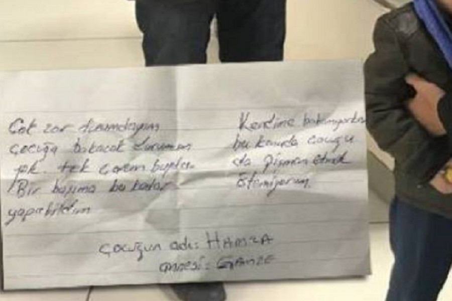 Bir süre anneyi arayan güvenlik görevlileri, çocuğun cebinde bir not buldu. Güvenlik görevlileri okudukları notta ''Çok zor durumdayım, çocuğa bakacak durumum yok. Tek Çarem buydu, Bir başıma bu kadar yapabildim. Kendime bakamıyorum, bu konuda çocuğumu da pişman etmek istemiyorum Çocuğun adı Hamza, annesinin Gamze'' ifadelerinin yazılı olduğunu gördü
