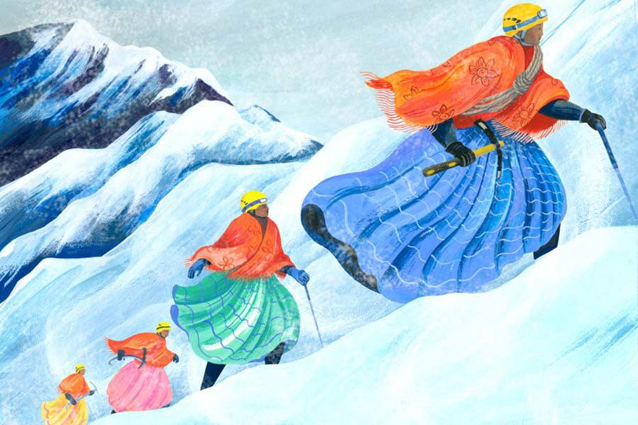 “Cholalar” birbirlerine halatlarla bağlı Huayna Potosí’nin dik yamacında antreman yapıyor. O bir Aymara olan Bolivya’nın ünlü spikeri Justa Canaviri, bu mücadeleci ruhu en iyi bilenlerden. Canaviri, Aymara kadınlarının Bolivya toplumundaki konumuna dair ‘ ‘Bu kadınlar bir tür ticaret yapıyorlar ve ekonomik bağımsızlıklarını üst sınıfa mensup beyaz kadınlardan daha önce elde ettiler” diyor.Kaynak: Anadolu Coğrafyası