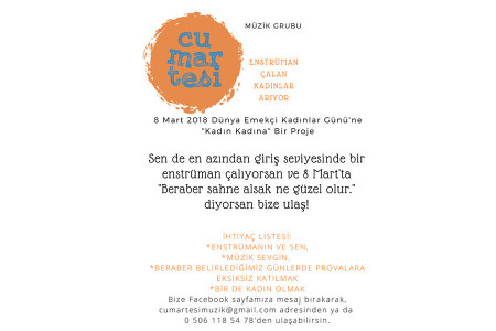 İzmirli müzik grubu Cumartesi, 8 Mart’ta beraber çalmak isteyen müzisyen kadınlar arıyor. Cumartesi’ye katılmak, 8 Mart’ta birlikte şarkılar söylemek ister misin?