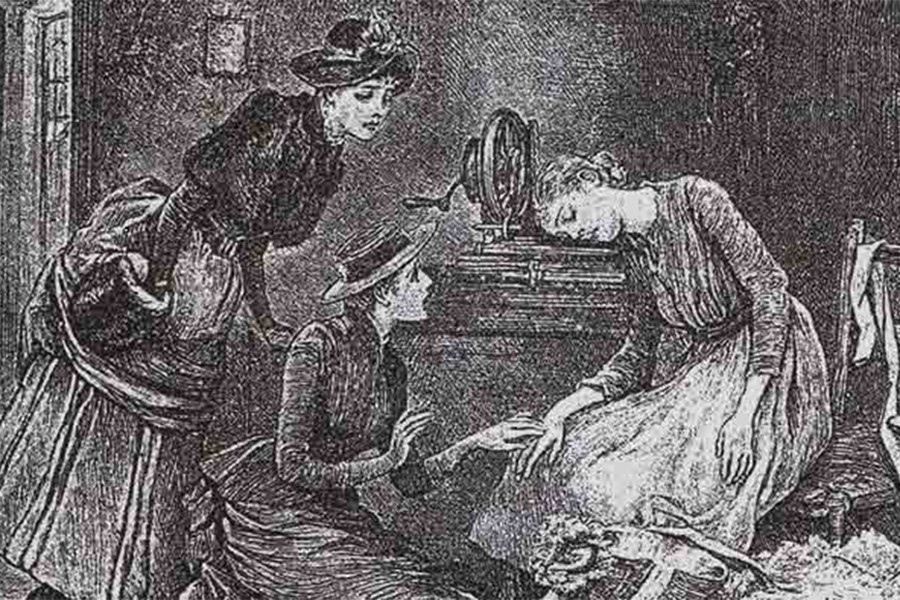“1863 yılının Haziran ayının son haftasında bütün Londra gazetelerinde ‘Death from Simple Overwork’ (fazla çalışmanın neden olduğu) ‘sensational’ (sansasyonel) başlığını taşıyan bir paragrafa yer verildi. Son derece saygın bir giyimevinde çalışan, Elise gibi tatlı isimli bir hanım tarafından sömürülen, yirmi yaşındaki elbise dikicisi Mary Anne Walkley’in ölümünden söz ediliyordu. Sık sık anlatılan eski öykü şimdi yeniden keşfedilmişti. Bu kızlar günde ortalama 16.5 saat, işlerin arttığı dönemde ise sık sık hiç ara vermeden 30 saat çalışıyordu; ‘emek gücü’ yorgunluktan bitap düştükleri zamanlarda, ara sıra verilen sherry, Porto şarabı ya da kahveyle canlandırılıyorlardı. Sezonun en civcivli zamanıydı. Soylu hanımların Galler’den yeni ithal edilmiş prensesin şerefine verilen baloda teşhir edecekleri muhteşem elbiselerin göz açıp kapayıncaya kadar dikilip hazırlanması gibi büyük bir iş vardı. Mary Anne Walkley diğer 60 kızla birlikte hiç ara vermeden 26.5 saat çalışmıştı; her bir odada 30 kız çalışıyordu; odada 30 insan için gerekli havanın üçte biri ya vardı ya yoktu; geceleri bir yatakta ikişer ikişer yatıyorlardı; ve yatakları boğucu odalardan birinde, tahtalarla ayrılmış bir bölmede bulunuyordu. Ve üstelik bu da Londra’nın en iyi modaevlerinden biriydi. Mary Anne Walkley cuma günü hastalandı ve öncesinde son işini de bitiremeden, Bayan Elise’yi şaşkın bırakarak pazar günü ölüp gitti. Ölüm döşeğine çok geç çağrılmış olan hekim, Dr. Keys “coroner’s jury” (şüpheli ölüm soruşturması jürisi) önünde kuru bir dille tanıklık etti: