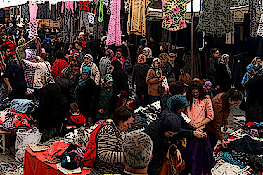 Bu kısa duraklama sonrasında, kadınların elleri, rengarenk, karmakarışık, kocaman bir kütle halinde duran giysi tepesinin içine dalıyor yeniden. Aralardan çekip çıkardıkları kazakları, hırkaları havaya kaldırıp, çamaşır asarmış gibi tutuyorlar bir süre. Başlarını biraz geriye çekip inceliyorlar, orasını burasını çekiştiriyorlar. Beğendiklerini, kimisi garsonlarınki gibi bükülmüş kollarında biriktiriyor, kimisi de tellakların havlusu gibi omuzlarında. Beğenmediklerini, canlı bir organizma gibi kıpraşan, bir alçalıp bir yükselen tepenin üzerine doğru fırlatıyorlar.