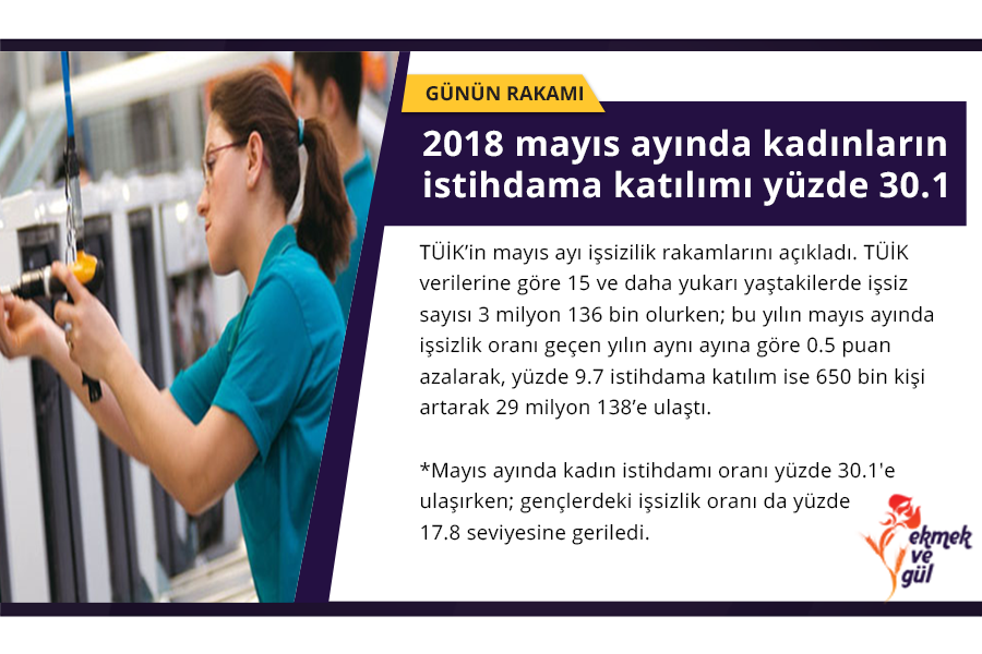 Mayıs ayında kadın istihdamı oranı yüzde 30.1'e ulaşırken; gençlerdeki işsizlik oranı da yüzde 17.8 seviyesine geriledi.