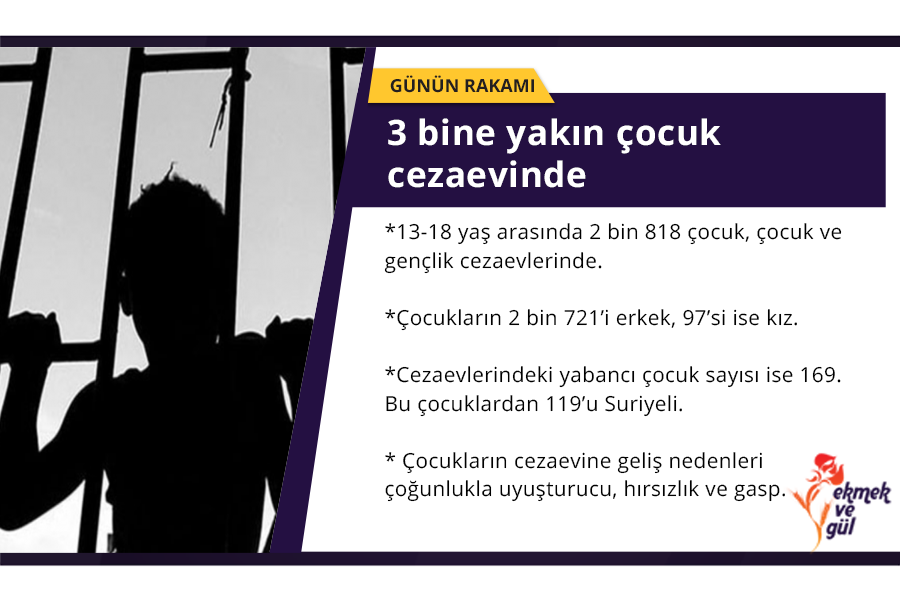 13-18 yaş arasında 2 bin 818 çocuk, çocuk ve gençlik cezaevlerinde. Cumhuriyetten Figen Atalay’ın haberine göre çocukların 2 bin 721’i erkek, 97’si ise kız. Bu çocukların yaklaşık yarısı yeniden suça sürüklenerek cezaevlerine dönüyor. Cezaevlerindeki yabancı çocuk sayısı ise 169. Bu çocuklardan 119’u Suriyeli. Çocukların cezaevine geliş nedenleri çoğunlukla uyuşturucu, hırsızlık ve gasp.
