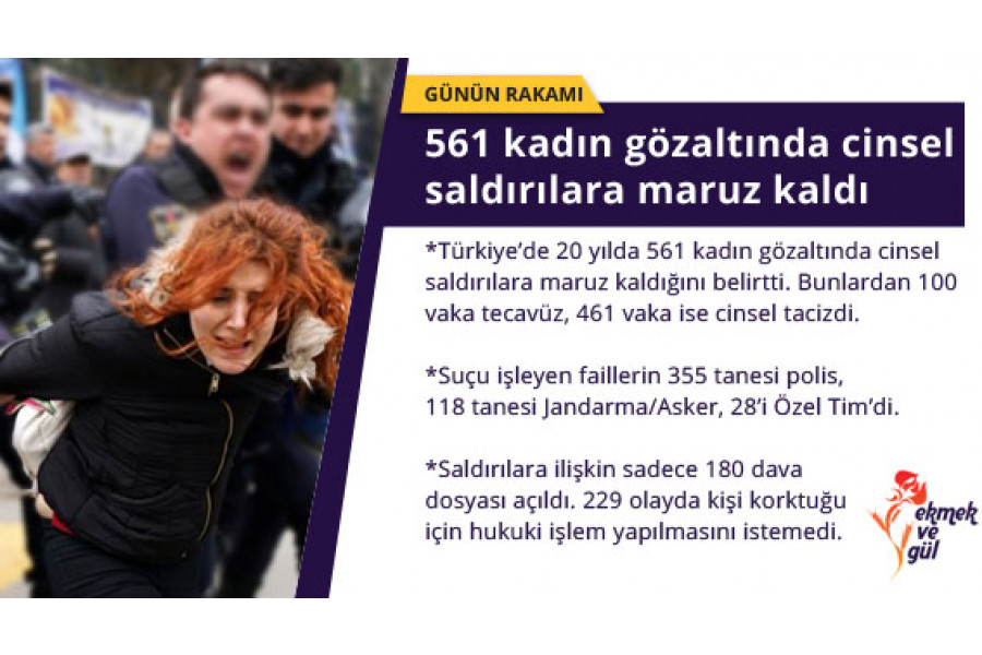 1997 yılından bu yana faaliyetine devam eden Gözaltında Cinsel Taciz ve Tecavüze Karşı Hukuki Yardım Bürosu, 25 Kasım dolayısıyla devlet şiddetine maruz kalan kadınlar ve trans bireyler hakkında sayısal verileri içeren bir rapor yayımladı. 20 yıllık sayısal verileri içeren raporda 561 kadın, çocuk ve trans bireyin gözaltında cinsel şiddet, taciz ve saldırılara maruz kaldığı belirtildi.