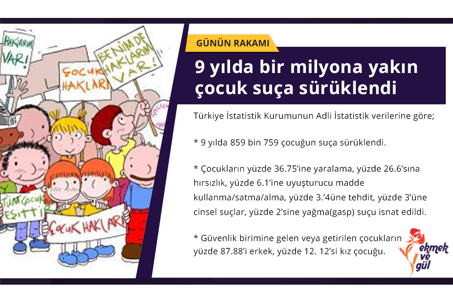 CHP Genel Başkan Yardımcısı Gamze Akkuş İlgezdi, Türkiye İstatistik Kurumu’nun Adli İstatistik verilerine göre 2008 ve 2016 yılları arasında “Suça sürüklenme nedeni” ile güvenlik birimlerine 859 bin 759 çocuğun getirildiğini açıkladı. Rapora göre;
