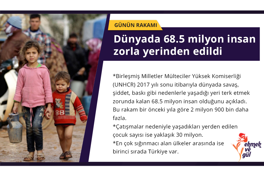 Birleşmiş Milletler Mülteciler Yüksek Komiserliği (UNHCR) 2017 yılı sonu itibarıyla dünyada savaş, şiddet, baskı gibi nedenlerle yaşadığı yeri terk etmek zorunda kalan 68.5 milyon insan olduğunu açıkladı. Bu rakam bir önceki yıla göre 2 milyon 900 bin daha fazla. Böylece İkinci Dünya Savaşı’ndan bu yana en üst seviyeye ulaşıldı. Çatışmalar nedeniyle yaşadıkları yerden edilen çocuk sayısı ise yaklaşık 30 milyon.