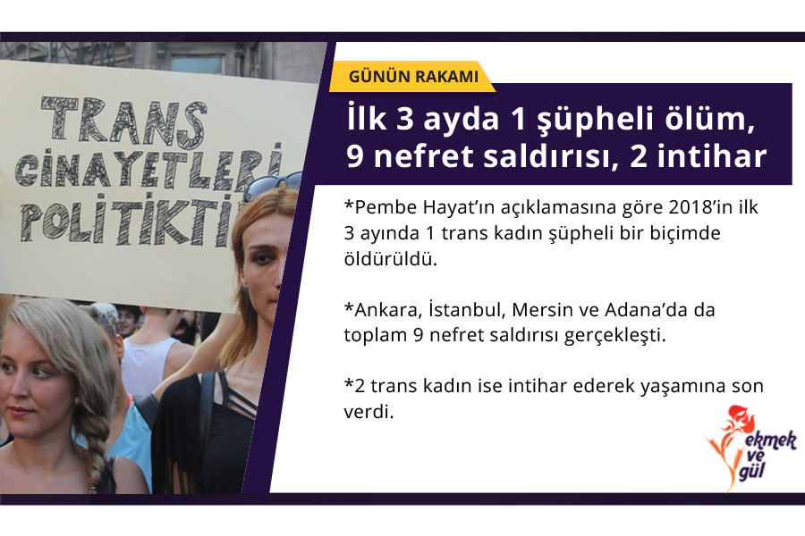 *Fabrikadaki işinden cinsiyet kimliği nedeniyle ayrılan Elif, sonrasında aile baskısına dayanamayarak İzmir’de kaldığı erkek arkadaşının evinin çatısından atlarken, İstanbul’da bir trans kadın daha eğlence mekanı çıkışı evinin çatısından atlayarak intihar etti.