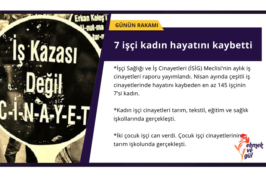 İşçi Sağlığı ve İş Cinayetleri (İSİG) Meclisi'nin aylık iş cinayetleri raporuna göre Nisan ayında çeşitli iş cinayetlerinde en az 145 işçi, 2019'un ilk dört ayında da en az 545 işçi yaşamını yitirdi.