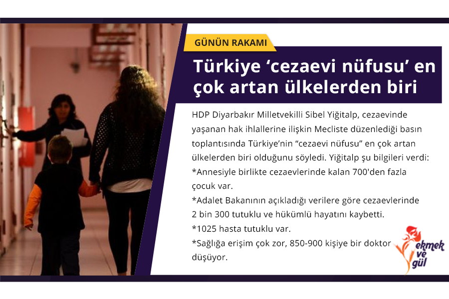 HDP Diyarbakır Milletvekilli Sibel Yiğitalp, cezaevinde yaşanan hak ihlallerine ilişkin Mecliste düzenlediği basın toplantısında Türkiye’nin “cezaevi nüfusu” en çok artan ülkelerden biri olduğunu söyledi. Yiğitalp şu bilgileri verdi: