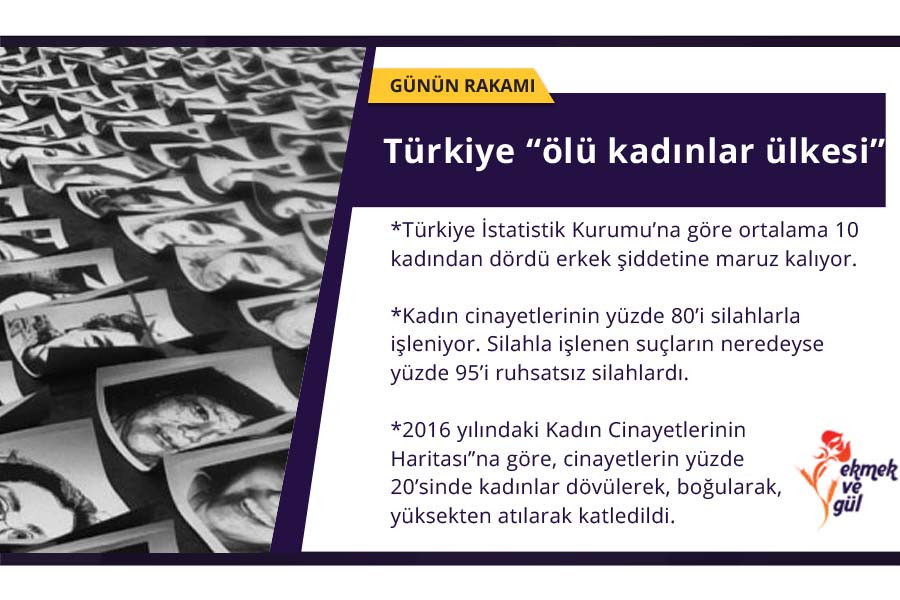 *Kadın cinayetlerinin yüzde 80’i silahlarla işleniyor. Emniyet Genel Müdürlüğü Özel Güvenlik Daire Başkanlığı Bireysel Silahlanmaya Dair 2017 Yılı Raporu’na göre Eylül 2017 itibarıyla 63.453 adet silah ruhsatı verilmiş ve silahla işlenen suçların neredeyse yüzde 95’i ruhsatsız silahlarla işlendi.