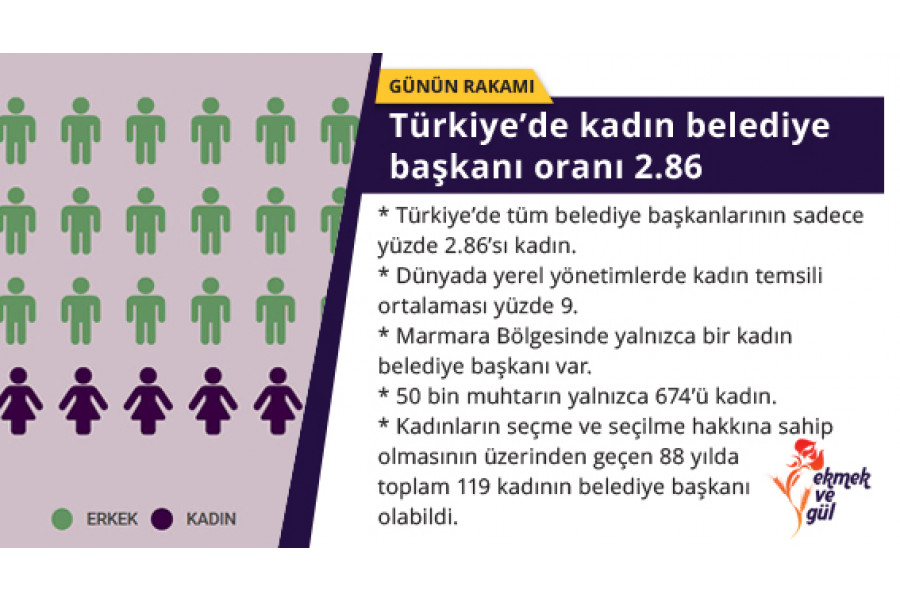 * Türkiye’de tüm belediye başkanlarının sadece yüzde 2.86’sı kadın. Dünyada ise yerel yönetimlerde kadın temsili ortalaması yüzde 9.