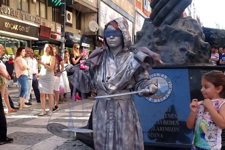 Konservatuvar öğrencisi Aleyna Çelik Adalet Yürüyüşü’nden etkilenerek Avcılar Marmara Caddesi’nde ‘adalet duruşu’ performansı gerçekleştirdi. Çelik Adalet Tanrıçası Themis’in heykeli oldu.