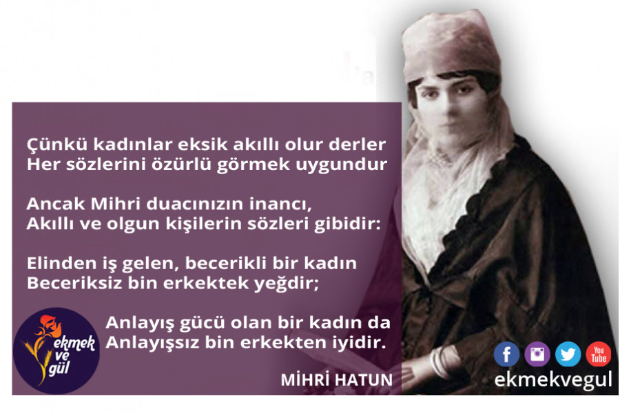 Mihrî Hatun, 15-16. yüzyıl divan edebiyatımızın, iki kadın şairinden biri. Kadîrı dünyasını, duygularını, alışılmış kalıplarını zorlayarak, açıkça ve kadınca söylemeyi başaran tek kadın divan şairi. Sevgililerini adlarıyla anacak kadar da cesur. Divan edebiyatımızı inceleyen yabancı uzmanlar onu Safo ile kıyasladılar ve 'o dönemde Doğulu bir kadının bu biçimde şiirler yazmasını şaşılacak bir durum' olarak nitelendirdiler,