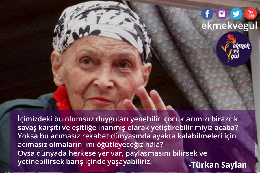 “İçimizdeki bu olumsuz duyguları yenebilir, çocuklarımızı birazcık savaş karşıtı ve eşitliğe inanmış olarak yetiştirebilir miyiz acaba? Yoksa bu acımasız rekabet dünyasında ayakta kalabilmeleri için acımasız olmalarını mı öğütleyeceğiz hâlâ? Oysa dünyada herkese yer var, paylaşmasını bilirsek ve yetinebilirsek barış içinde yaşayabiliriz!”