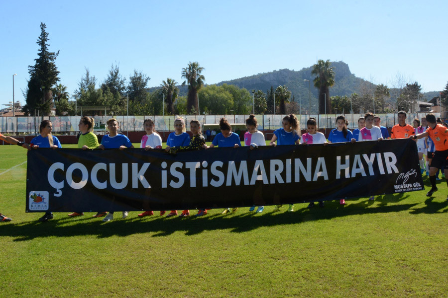 Kadınlar 3'üncü Lig 14'üncü Grup'ta lider Yeni Kemer Belediye Spor, ligin sondan bir önceki haftasında, sahasında Yeni Burdur Spor'u konuk etti. Kemer İlçe Stadı'ndaki maçta iki takım oyuncuları ve hakemler sahaya 'Çocuk istismarına hayır' yazılı pankartla çıktı.