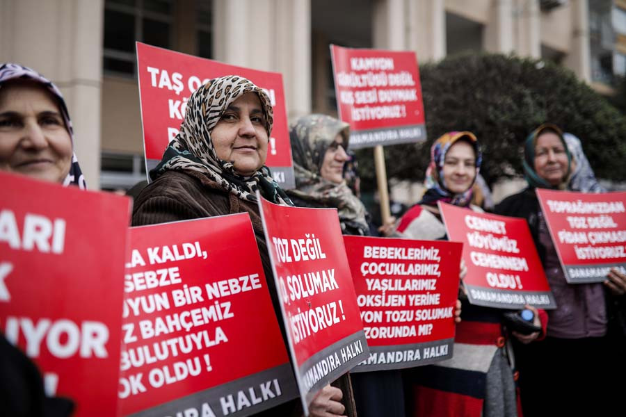 Silivri Danamandıra Köyü sakinleri İstanbul Çevre ve Şehircilik İl Müdürlüğü önünde taş ocağı protestosu gerçekleştirdi. Yine en önde ellerinde dövizlerle kadınlar vardı.