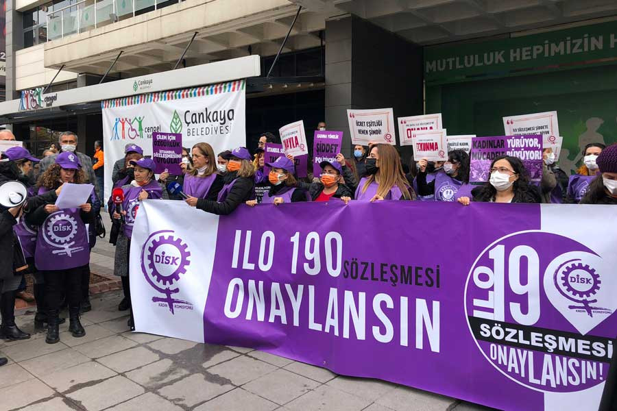 DİSK Kadın Komisyonu, ILO 190 Sayılı Sözleşmenin Türkiye tarafından onaylanması için basın açıklaması yaparak kampanya başlattığını duyurdu.