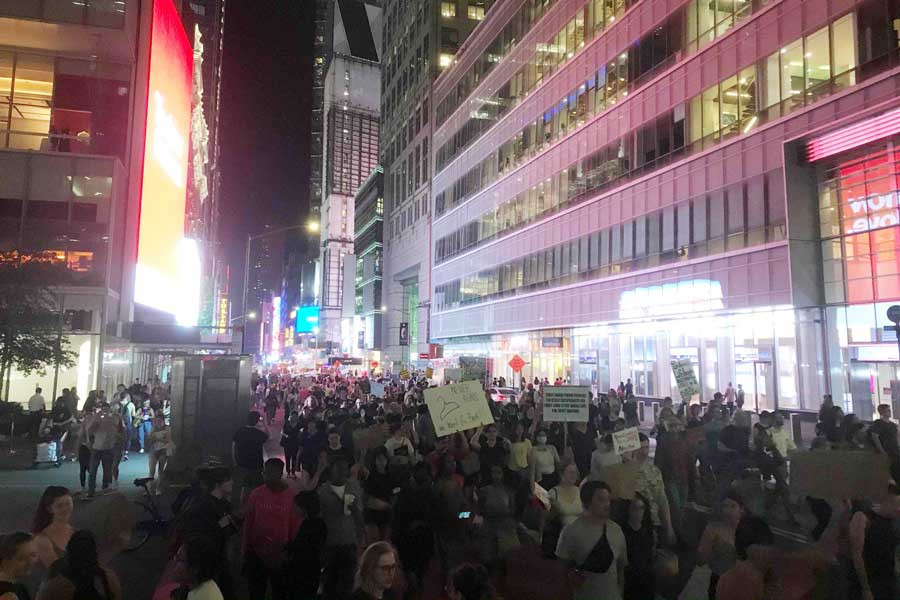 New York eyleminde binlerce kişi Washington Square Park’ta ABD doğu yakası saatiyle akşamüstü 6.30’da buluştu. Çoğunu genç kadınların oluşturduğu kalabalıkların bir kısmı eylemi Union Meydanı’nda diğer kısmı ise NY demokrat senatörü Chuck Schumer’in ofisini hedefleyerek yürüdü, protesto eylemi Bryant Park’ta sonlandırdı. Ellerde taşınan dövizlerde yaşamını yitiren Yüksek Mahkeme yargıcı Ruth Bader Gingburg’u kastederek “Ruth bizi gönderdi” yazıldı. Eylemlerde Demokratlara tepki hissedilirken, Kiliseyi ve devleti hedefleyen sloganlar da atıldı.